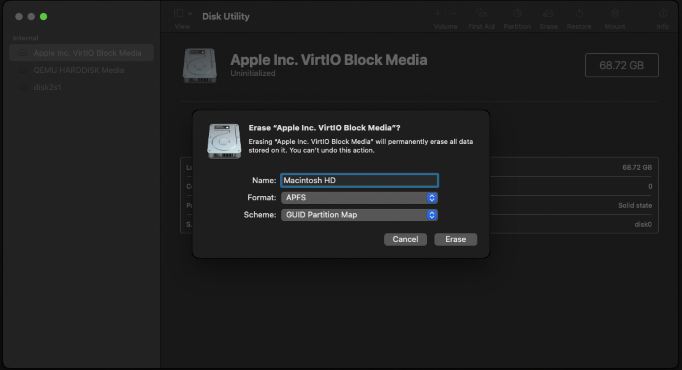 Apple Inc. VirtIO Block Mediain your Disk Utility window. Select theErasetool to reformat the volumes and change the name toMacintosh HD.